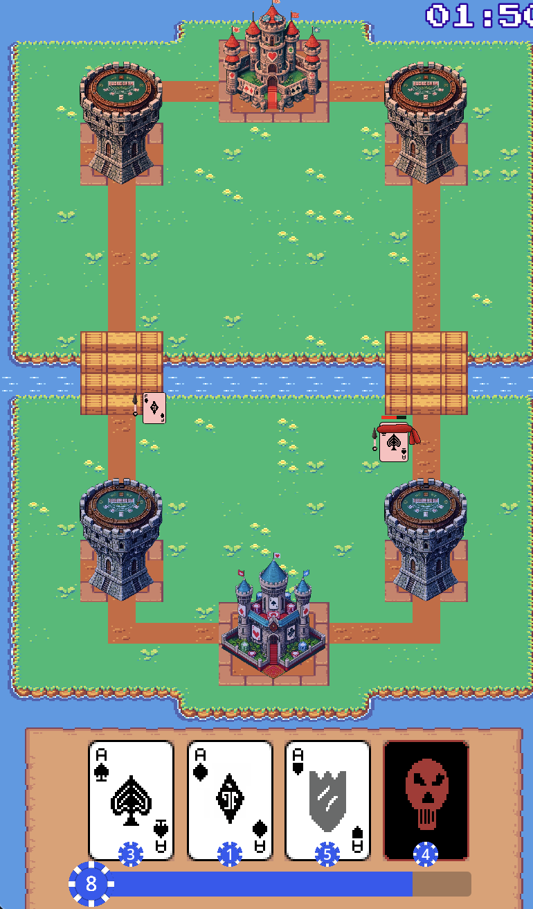 This game features two lanes with two towers and a base, the player is given a deck of poker themed cards that they can place on the battlefield that will then battle it out with the enemy