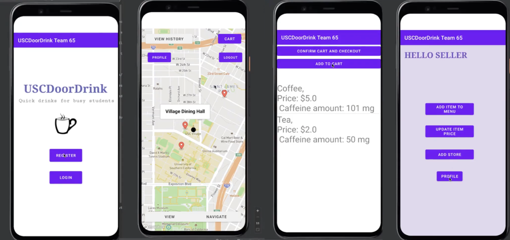 Android application replicating the functionality of a food delivery app such as DoorDash or Uber eats. It can track a persons profile, their daily caffeine intake, give recommendations, and can give an expected delivery time in addition to visually showing the route taken. Created using Android Studio (Java) with a Firebase backend and the MapBox API for the mapping/directions.